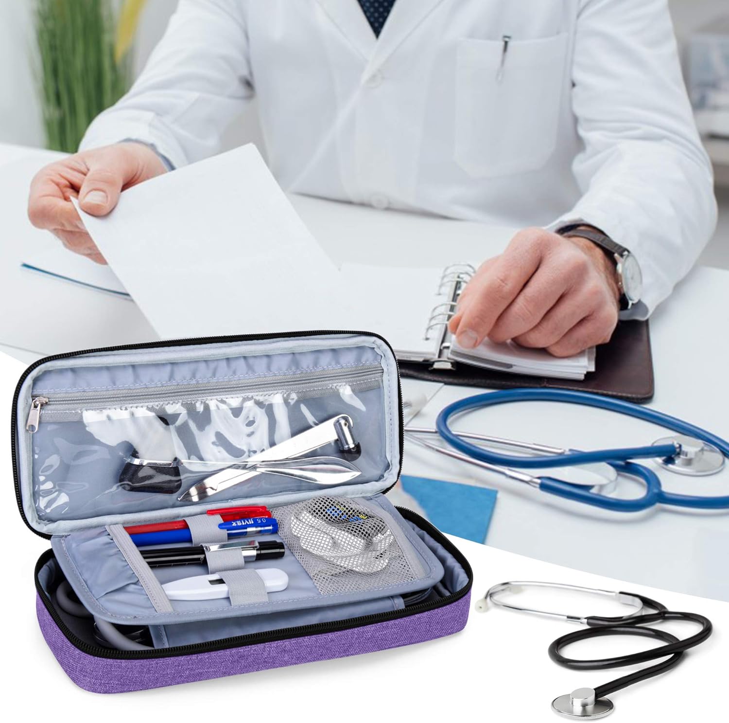 HIGH CAPACITY: Inner insert dividers this bag into two rooms, one for stethoscope, the other for nurse accessories. The elastic loops with bottom slots can fix your penlight, scissors, reflex hammer. The cover with fastener strip can keep your stethoscope in place.